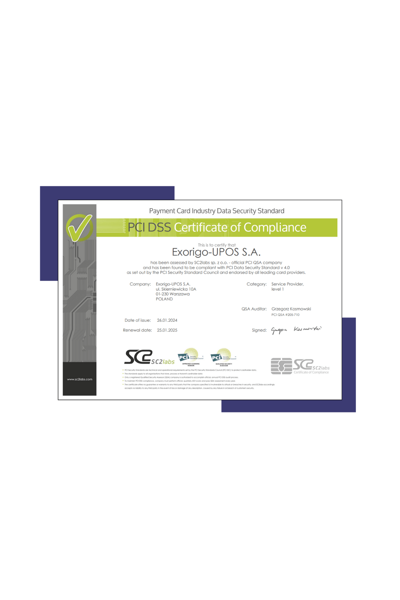 Komplet certyfikatów gwarantujących bezpieczeństwo transakcji kartami płatniczymi w całej sieci sprzedaży, w tym certyfikat PCI P2PE oznaczający najwyższy standard bezpieczeństwa.